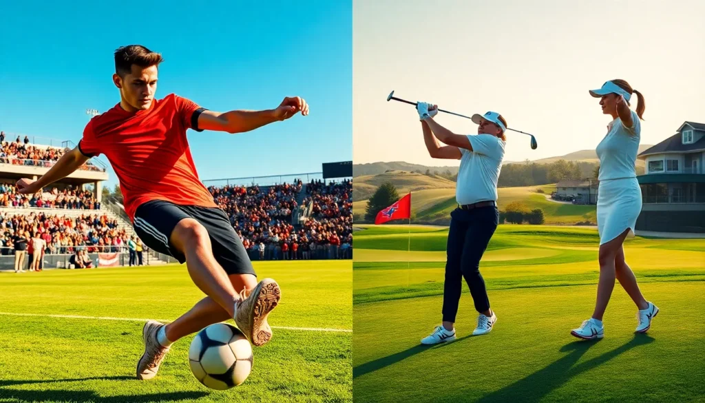 A football match and golf game contrasting under a sunny sky.